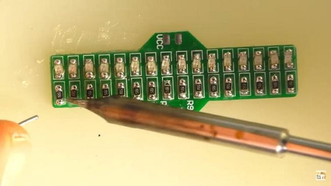 Когда все резисторы припаяны, переходим к светодиодам, их зеленая точка должна находится в том же направлении, что и полоска на маркировке платы, в противном случае светодиоды не заработают и потребуется менять их положение. Светодиоды припаиваем аналогично резисторам, сначала с одной стороны, а затем с другой.