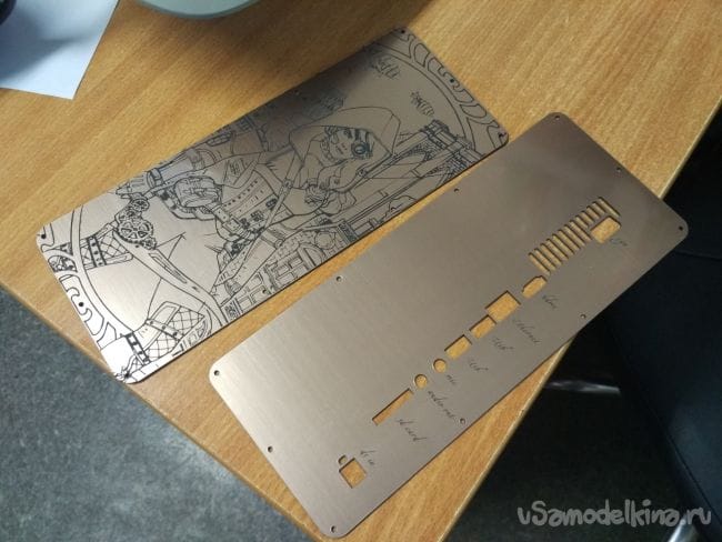 Далее пришлось попотеть с подгонкой отверстий под разъемы. Несколько пробных трафаретов из картона и все было готово, чтобы вырезать оставшиеся стенки. Вырезал так же на лазерном станке из пластика 2мм толщиной для гравировки, ну и сделал гравировку для красоты.