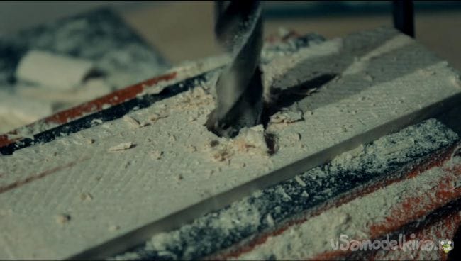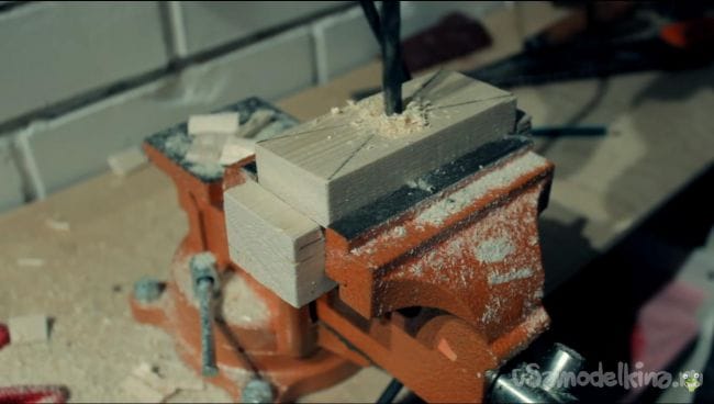Пришло время сделать прижимную часть. Фиксируем верхний брусок широкой стороной вверх в тисках и размечаем его центр, сделав две линии по диагонали. Далее устанавливаем сверло диаметром 8 мм в патрон электродрели и просверливаем отверстие в центре бруска, при этом совместив два бруска, чтобы наметить центр в основании. При работе с электроинструментом будьте аккуратны и используйте средства индивидуальной защиты, такие как очки и перчатки.