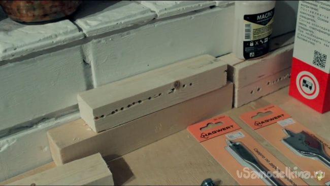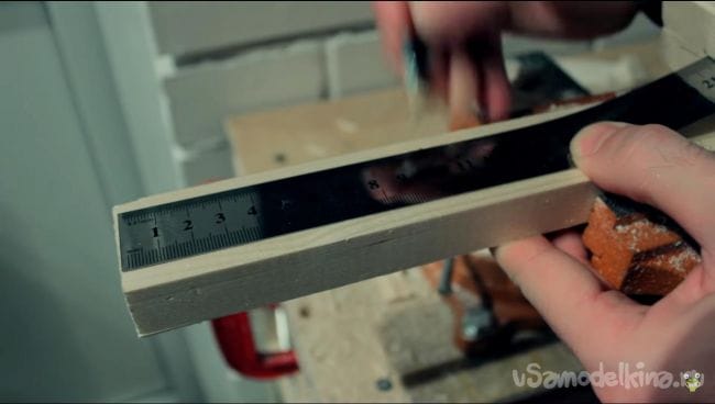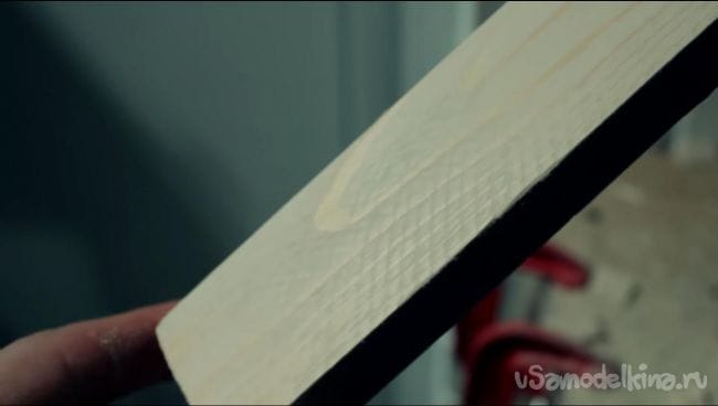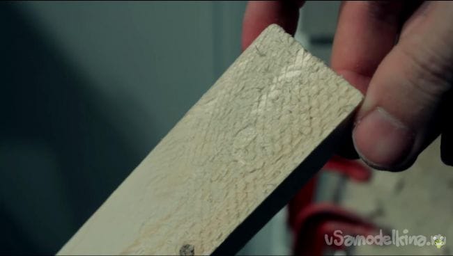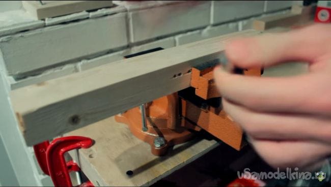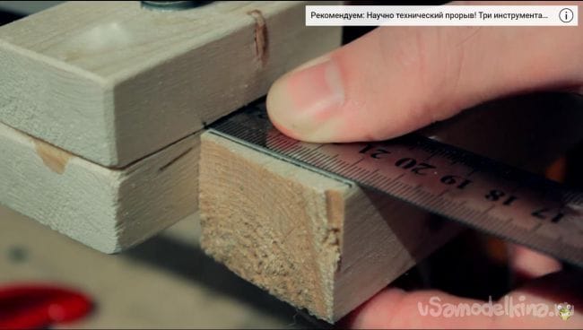 При помощи ножовки по дереву отпиливаем нужную часть бруска по ранее сделанным меткам. Оставшуюся часть бруска оставляем, возможно она пригодится для следующих самоделок.