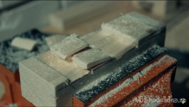 Для начала необходимо зажать деревянный брусок размерами 30*40 мм в слесарных тисках.
