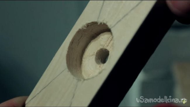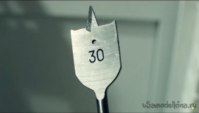После этого устанавливаем перьевое сверло на 30 мм и делаем углубление на половину толщины бруска, это необходимо для того, чтобы при фиксировании наждачной бумаги с помощью барашка, он не упирался в руку, а был в углублении.