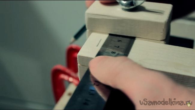 Далее зажимаем брусок размерами 20*40 мм в тиски и переносим ранее замеренную длину углубления с учетом вычитания 5 мм, которая вышла ровно в 100 мм.