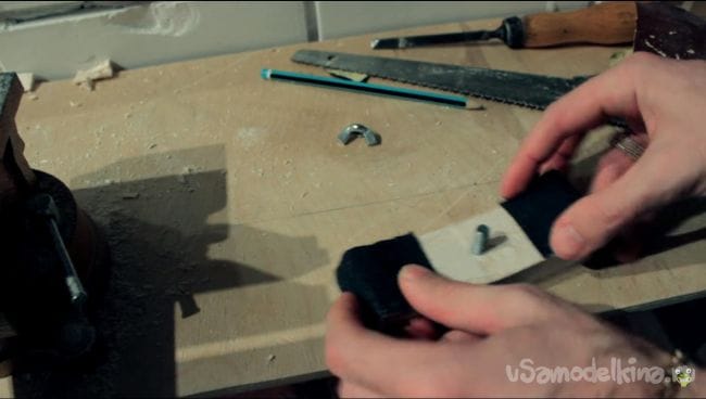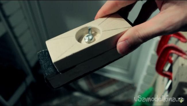 Далее просовываем в готовое отверстие болт М10 и вбиваем его при помощи молотка. На этом этапе инструмент практически готов, осталось установить наждачную бумагу на свое место. По ширине бруска отрезаем полоску наждачной бумаги, после чего заворачиваем ее вокруг основания, чтобы немного наждачки находилось в углублении и сверху прижимаем ее бруском и фиксируем при помощи барашка.