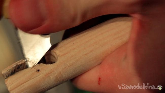 Закрепляем черенок в тисках, при зажатии можно подложить какую-либо деревяшку для того, чтобы не осталось следов от губок тисков. При помощи углошлифовальной машинки делаем пропил в черенке около 4 см. Далее сверлом на 8 мм делаем отверстие в конце пропила и подравниваем края получившегося паза наждачной бумагой и канцелярским ножом.