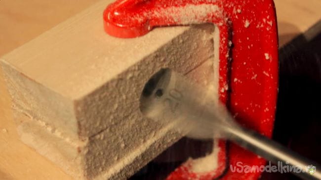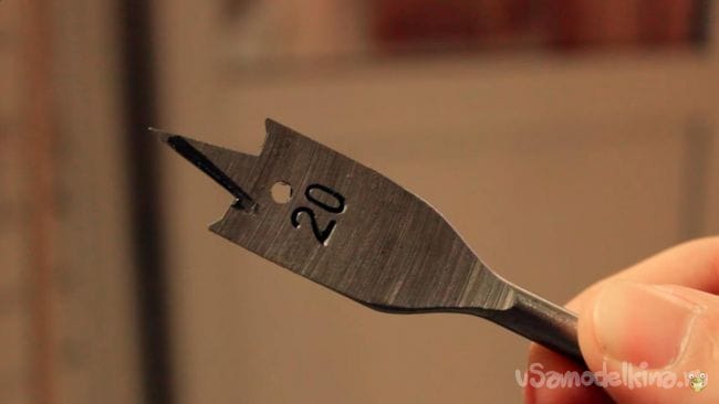 После этого берем перьевое сверло диаметром 20 мм и устанавливаем в патрон электродрели, далее размечаем карандашом центр двух заготовок и начинаем сверлить сквозное отверстие.