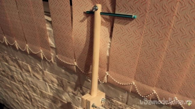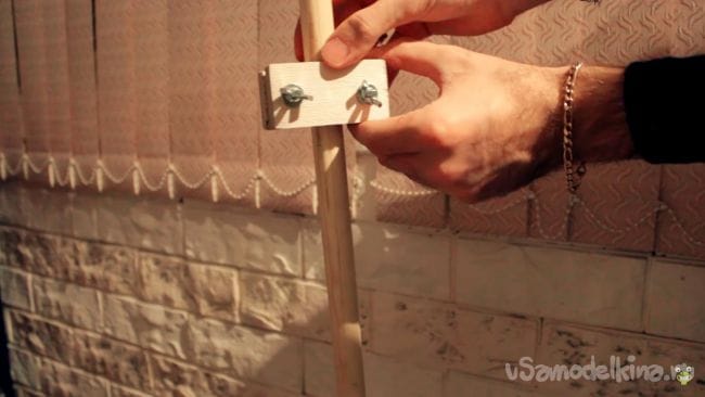 Соединяем две детали вместе, просовываем черенок в отверстие в двух брусках и закрепляем с помощью барашковых гаек.