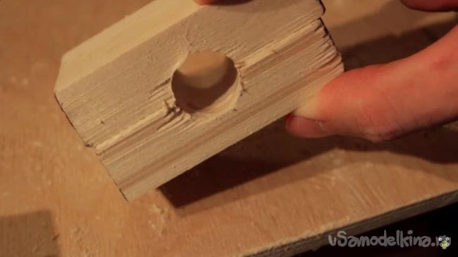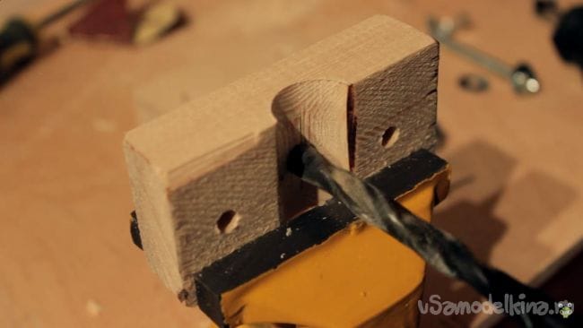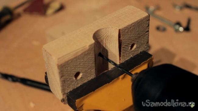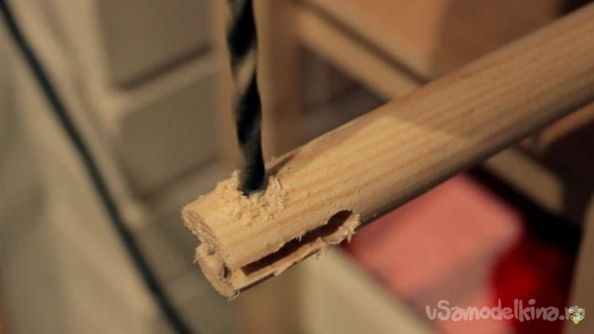 Далее зажимаем в патрон дрели сверло на 6 мм и просверливаем два отверстия в брусках, отступив от каждого края около 15 мм.