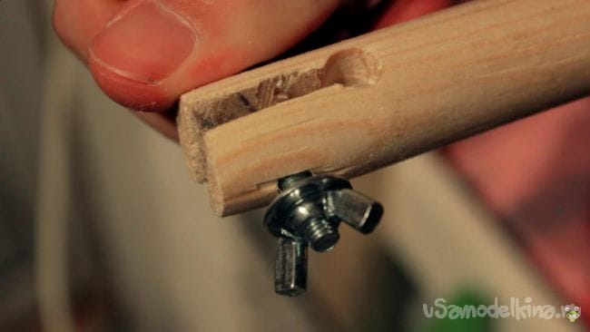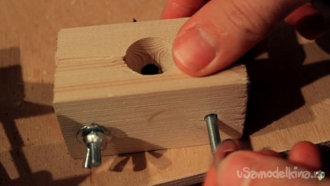Затем вставляем винт М5 длиной 30 мм в готовое отверстие, накидываем шайбу, барашковую гайку и устанавливаем карандаш в 8-ми миллиметровое отверстие, после чего барашком можно зафиксировать положение карандаша.
