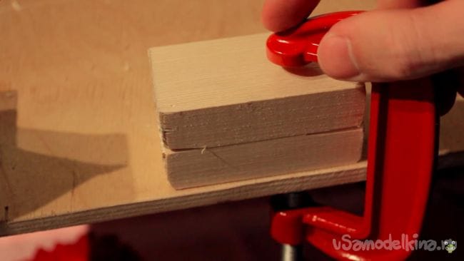 Совмещаем два бруска вместе и прижимаем их к верстаку при помощи струбцины.