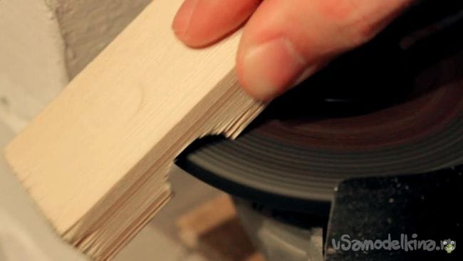 Шлифуем деревянные бруски при помощи УШМ, зажатой на верстаке, чтобы убрать заусенцы, которые образовались в процессе отпиливания и сгладить острые края. При работе с углошлифовальной машинкой будьте аккуратны, используйте средства индивидуальной защиты, очки и перчатки. Также надевайте респиратор, так как в процессе шлифования выделяется много древесной пыли, которая вредна для дыхательных путей.