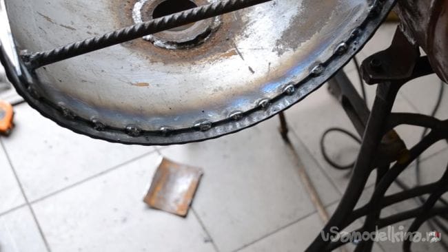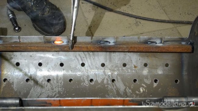 Так как температура в мангале достаточно высокая, было решено усилить дверцу, приварив две арматуры диаметром 10 мм по краям.