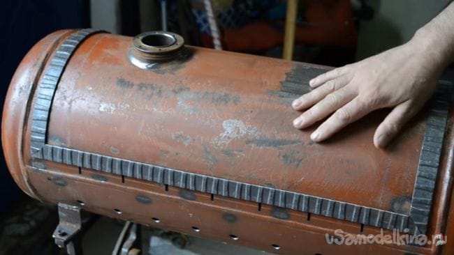 Для установки шампур в мангале необходимо сделать специальные отверстия и пропилы. При открытой дверце наносим разметку на баллон, расстояние между каждой прорезью составляет 70 мм, их делаем с помощью углошлифовальной машинки. Ширину прорезей стараемся делать одинаковой порядка 4 мм.