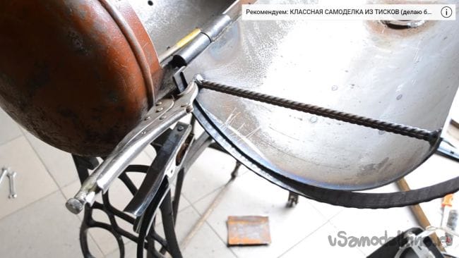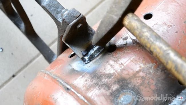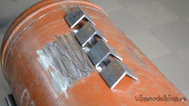 Далее устанавливаем баллон на уголки и делаем несколько прихваток сварочным аппаратом, после чего кладем мангал и окончательно обвариваем крепления. Молотком удаляем образовавшийся шлак в процессе сварки.