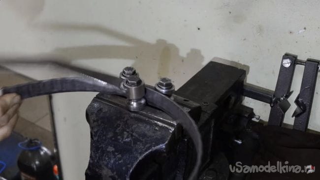 Металлическую шинку изгибаем на самодельном трубогибе из тисков.