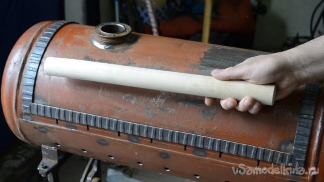 Для того, чтобы можно было открывать дверцу мангала и не обжигаться делаем ручку. Берем черенок от лопаты и отпиливаем от него отрезок длиной 450 мм.