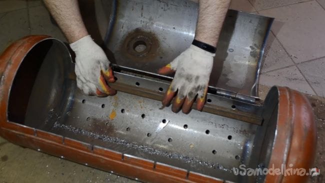 Так как мангал иногда будет использоваться как барбекю, необходимо сделать упоры для сетки. Берем металлическую профильную трубу размерами 20*20 мм и прижимаем к стенке мангала ручными тисками в месте, где заканчиваются прорези.
