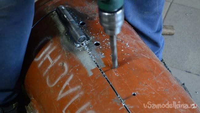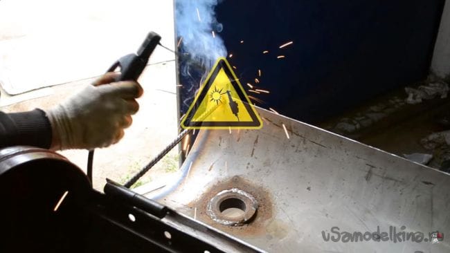 При помощи зачистного металлического круга и углошлифовальной машинки зачищаем места, где будут крепиться петли. После этого подкладываем под петлю две тонкие пластинки для обеспечения нужного зазора и начинаем приваривать петли к дверце и баллону сварочным аппаратом. Сначала делаем прихватки, а затем, убедившись, что петли расположены соосно, окончательно провариваем их. При работе со сварочным аппаратом соблюдайте меры безопасности, используйте краги и сварочную маску.