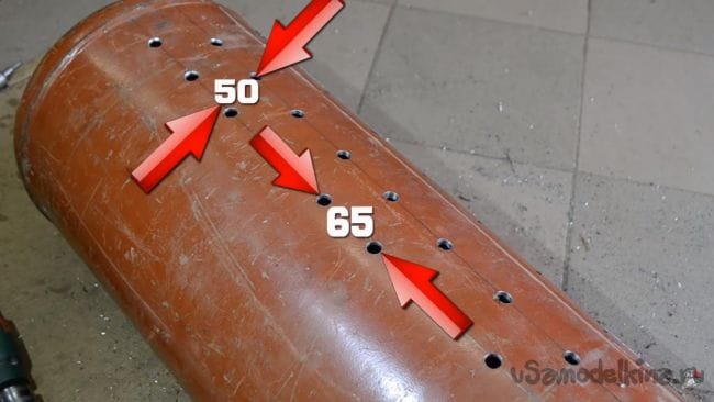 С обратной стороны баллона делаем разметку под установку концов шампур, расстояние между ними также 70 мм, при этом отступ от края должен быть 25 мм.