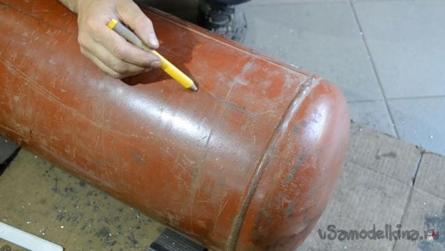 От нижней части баллона отмеряем 100 мм вверх и делаем разметку под раздувочные отверстия.