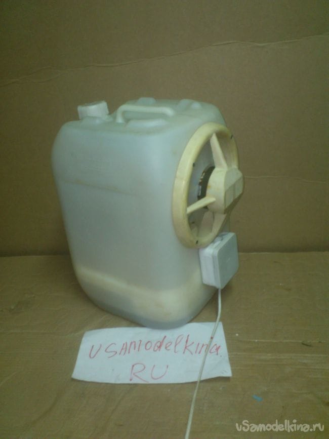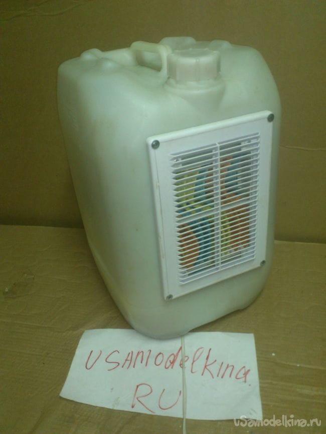 Начал я с того, что вырезал в боковой стенке канистры круглое отверстие и поместил туда вентилятор: