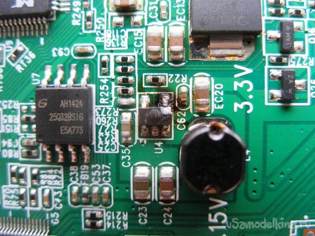 Всем привет, у меня сгорел Т2-тюнер «World Vision T34», точнее радиоэлемент на котором нанесена маркировка KV4KC (на фото черный, тот что имеет 5 ножек). Вопрос, что это за деталь, как называется на самом деле, и чем ее можно заменить?