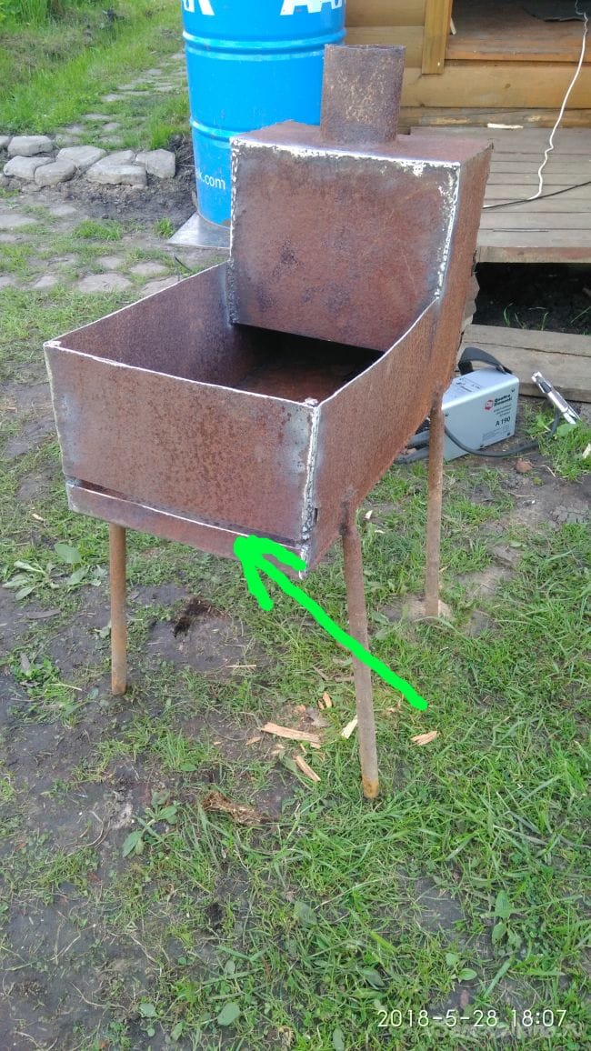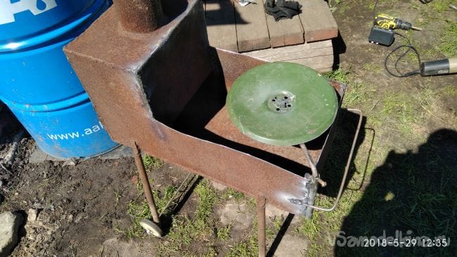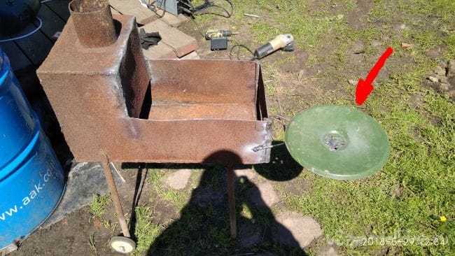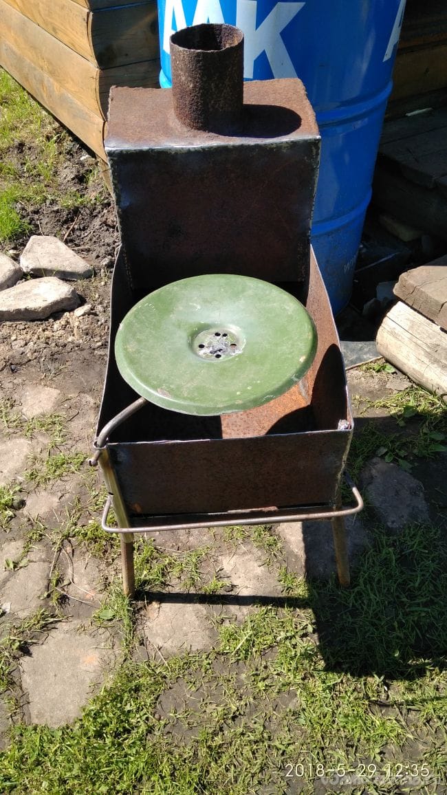 Ну вот и весь мангал, его можно перевозить, а на крышке можно что-то сварить или разогреть, или же отвернув в сторону от печки, поставить на её тарелку.