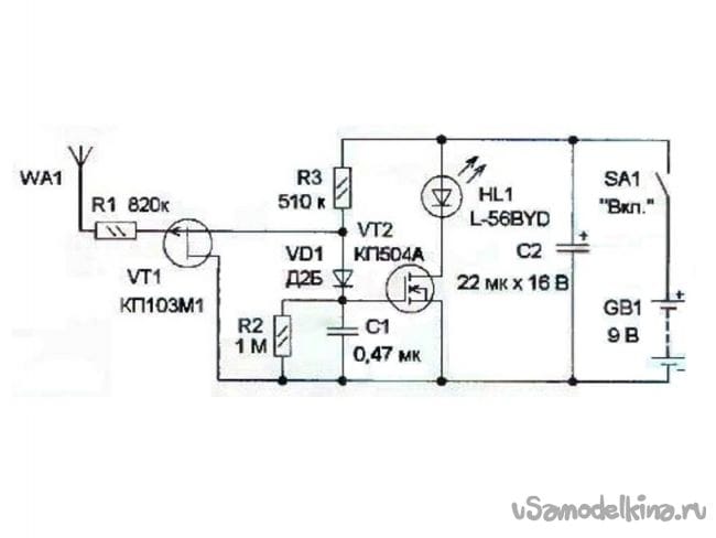 Например, антенну и полевой транзистор (реакция на наводку- 220 в, 50 Гц).