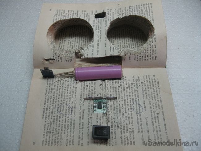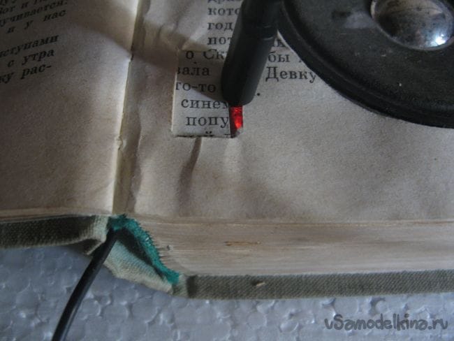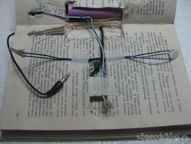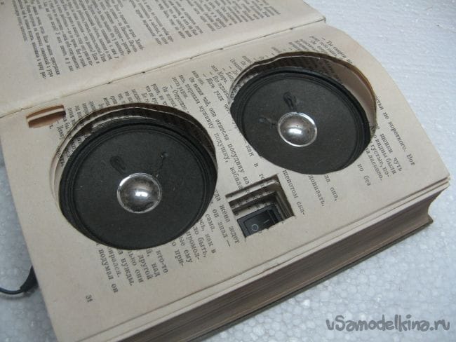 Закрываем книгу и подпаиваем динамики и выключатель. Проклеиваем страницы книги клеем ПВА.