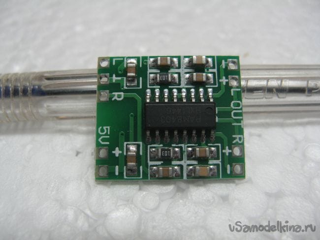 Усилителем будет готовая плата на микросхеме РАМ8403. Выходная мощность которой два по 3 Ватта, при питании 5.5 Вольт.