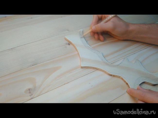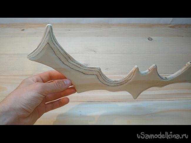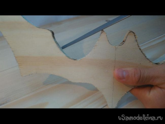 Шаг 2: Далее переводим шаблон на фанеру. Я взял фанеру толщиной 9 мм. Берём электрический лобзик и вырезаем получившийся бумеранг.