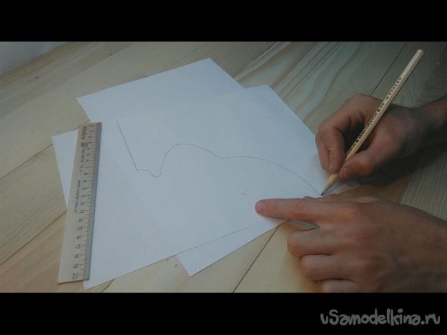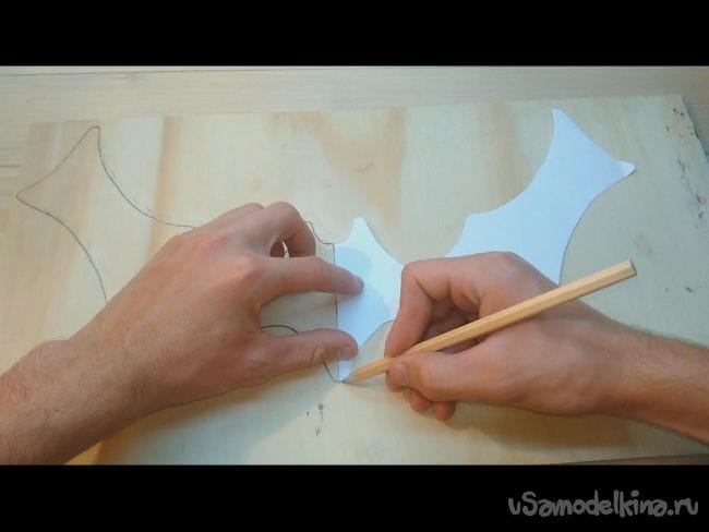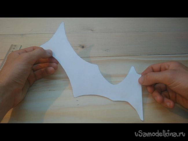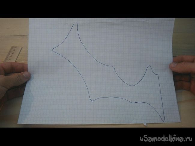 Шаг 1: Мы будем делать бумеранг в виде летучей мыши или же можно назвать его бумеранг Batman. Поэтому на листе А4 чертим половину бумеранга, другую часть чертить не нужно, ведь он может получится не симметричной, да и зачем тратить лишнее время. Мы просто "отзеркалим" вторую часть этим же шаблоном. После того как нарисовали шаблон, вырезаем его ножницами.