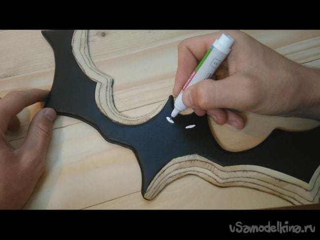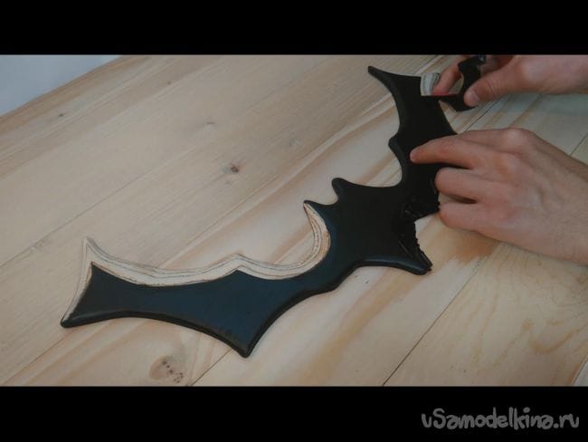 Шаг 5: Приступаем к покраске. Края которые мы сточили под угол, закрываем их изолентой. Далее краской из баллончика покрываем бумеранг в 2 слоя. Можно покрыть с верху лаком, чтобы наша "летучая мышь" не впитывала влагу. После полного высыхания снимаем изоленту. Канцелярской замазкой рисуем глаза.