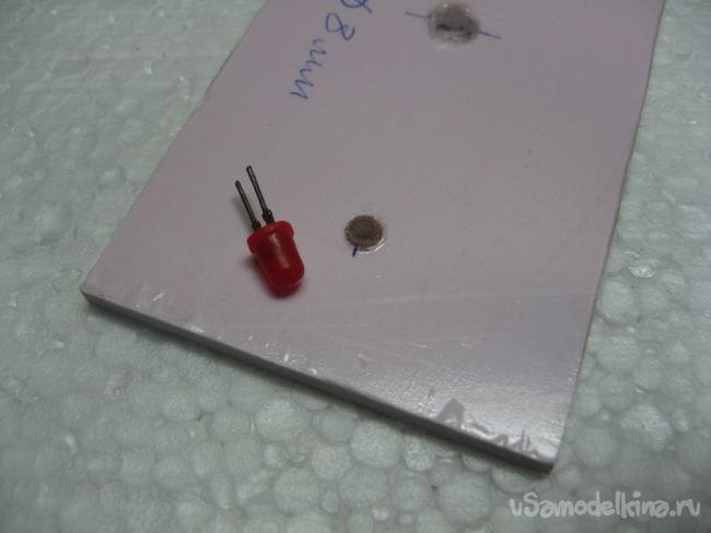 Также сверлю отверстие под светодиод. Он у меня на 5мм, отверстие просверлил меньшего диаметра. Так светодиод держится плотно.