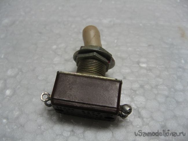 Выключатель можно применить любой. Будь то с двумя нормально разомкнутыми контактными группами. Или с одной группой. Я взял тумблер со старого телевизора.