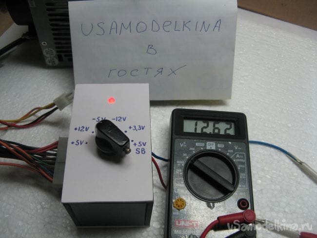 По схеме модуль очень прост. К разъему подключается проверяемый блок питания. К выходным клеммам мультиметр. Сразу загорается светодиод, индицируемый о присутствии дежурки 5 Вольт. Блок не стартует. Нажимаем выключатель и блок должен запуститься. Мультиметр показывает выходное напряжение установленное галетным выключателем. Меняя положения галетника, мы меняем напряжение на клеммах. Они должны быть в норме. Напряжения указаны на корпусе проверяемого блока питания. Подобным образом проверяется сопротивление по выходным напряжениям. Если напряжения в норме, то проверять сопротивления нет смысла.