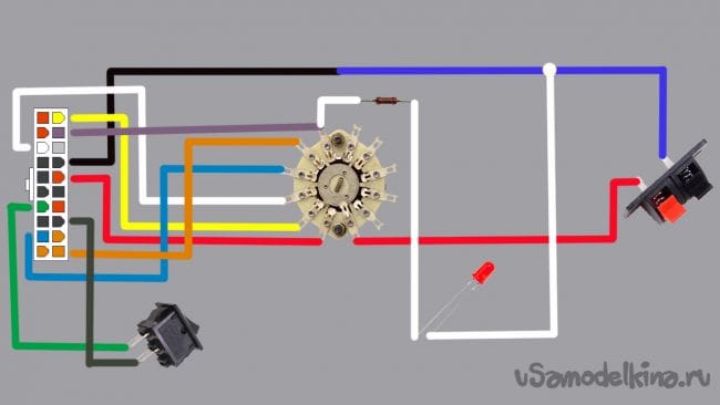 Далее закрепляю галетный переключатель. Устанавливаю выключатель. Так же припаиваю светодиод с резистором на провода дежурного напряжения. Вывожу выходные провода.