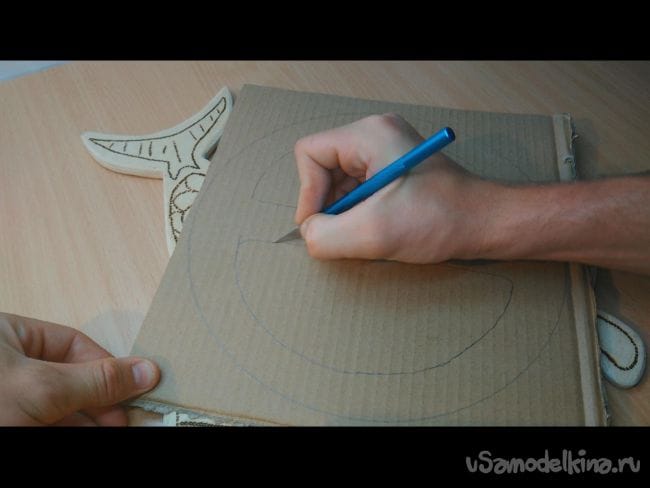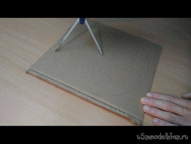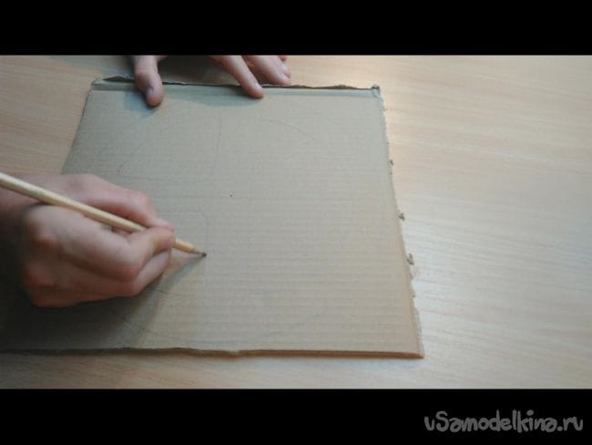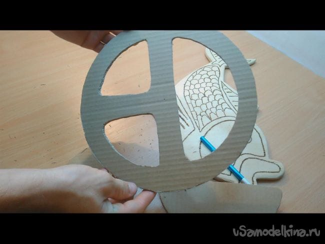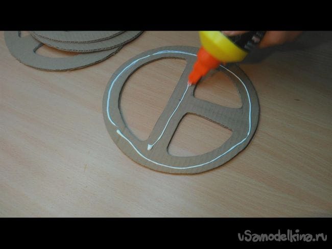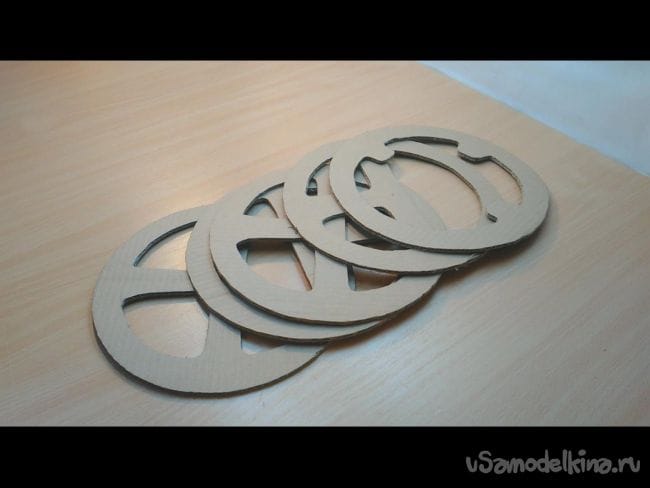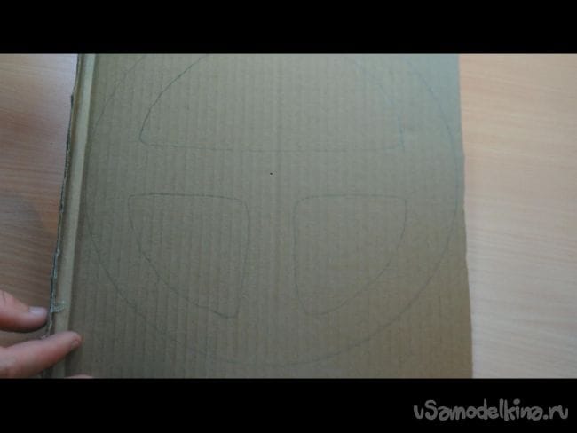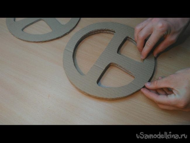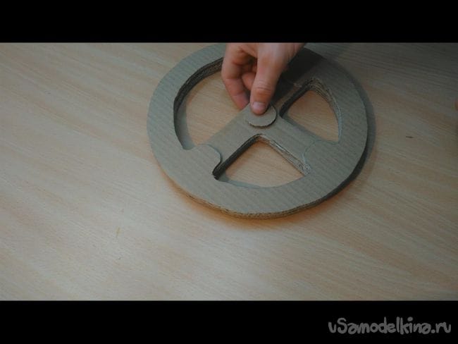 Шаг 1: На картоне циркулем делаем окружность- это будет будущий руль. Диаметр можно выбрать любой, хоть как на автомобиле ЗИЛ. Далее карандашом придаём более похожий вид рулю. И при помощи ножа вырезаем 4 таких заготовки, и ещё одну накладку как на фото.