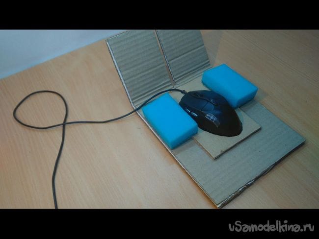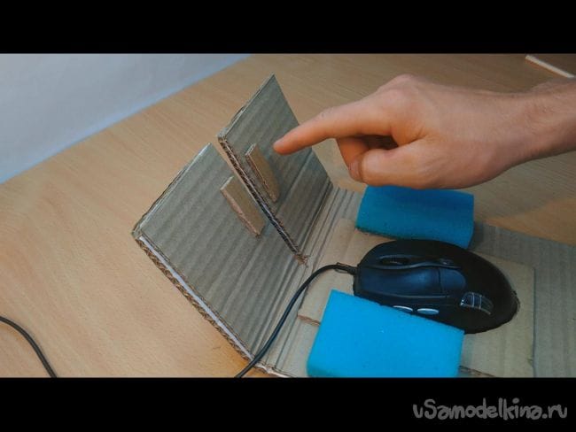 Шаг 9: Берём ещё одну компьютерную мышку и под неё вырезаем держатель. Далее приклеиваем её на заготовку, которую делали в 8 шаге, и вставляем мышь. Затем приклеиваем хозяйственные губки. На педали приклеиваем небольшие прямоугольники из картона.