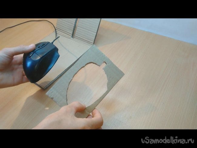 Шаг 7: Приклеиваем подставки под мышку и устанавливаем её. Нужно сделать так чтобы лазер мышки плотно касался середины деревянной палочки. Если не касается, то подматываем изоленту на палочку. На этом этапе лучше проверить как работает руль на компьютере. Можно подключить и покрутить руль, курсор мышки должен