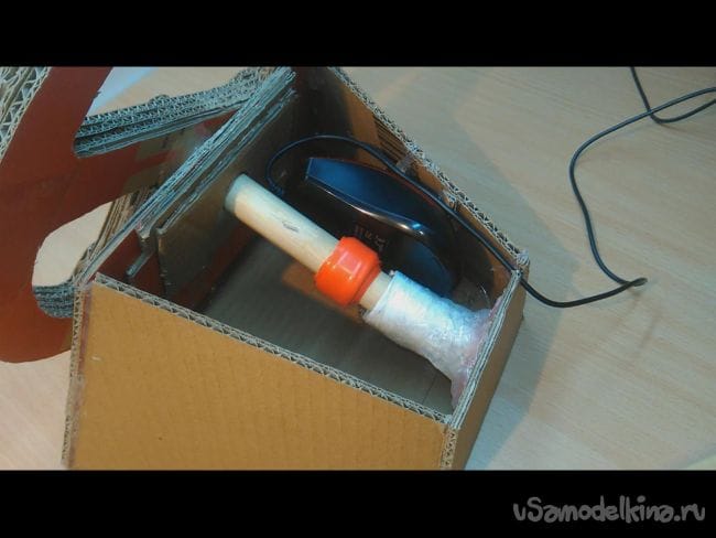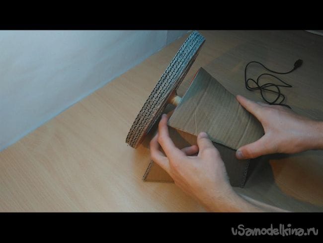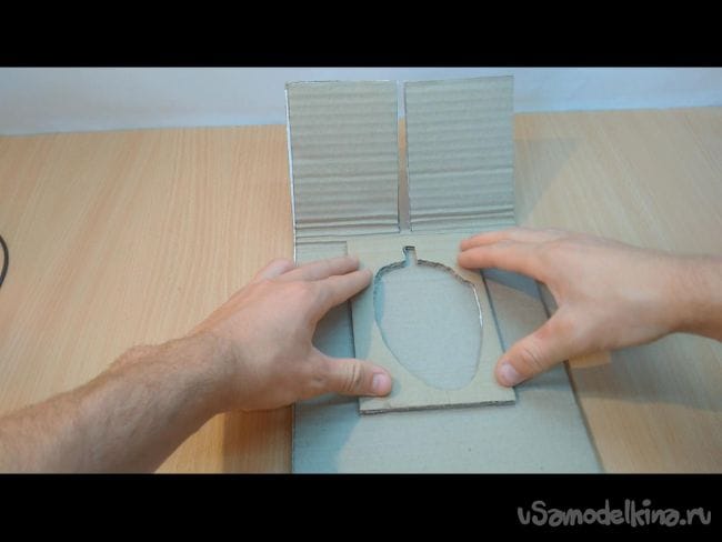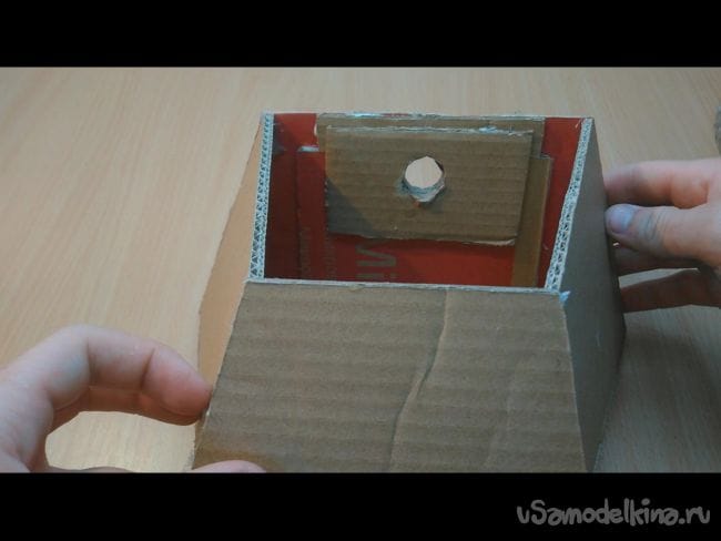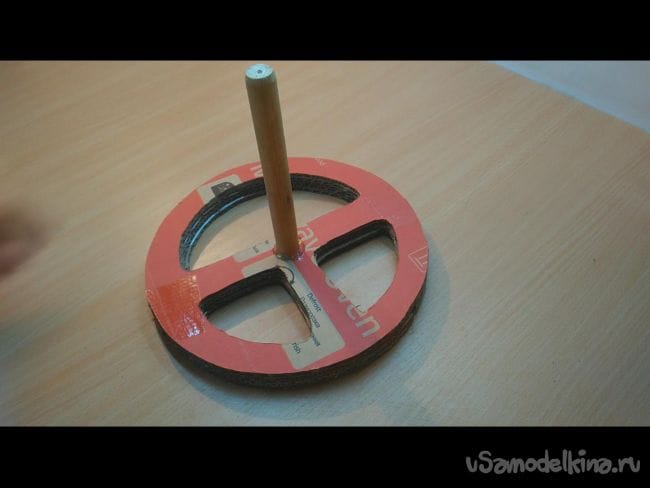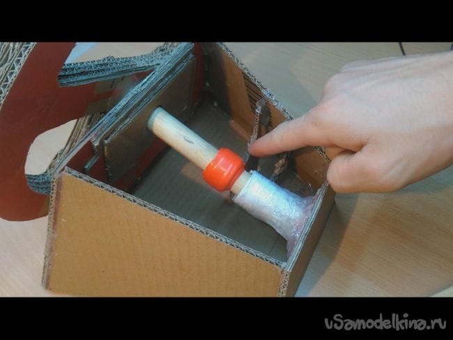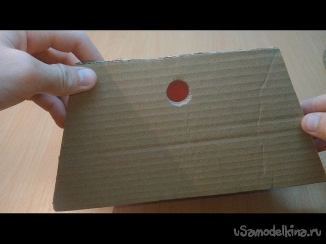 Шаг 5: Вырезаем отверстие диаметром чуть больше деревянной палочки. С другой стороны усиливаем картоном.