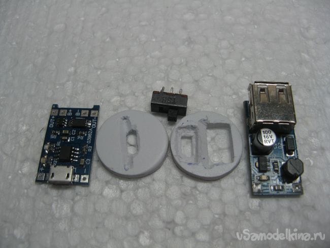 В заглушках вырезаем окна под разъемы. На заглушке с повышающим модулем еще и под выключатель. Так же сделал небольшие углубления, так наши разъемы и движок выключателя будут ближе к наружной поверхности.