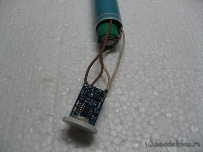 Плюсовой провод от контроллера заряда паяем на выключатель. Второй контакт с выключателя паяем на повышающий модуль. Минус идет напрямую от контроллера к повышающему модулю.