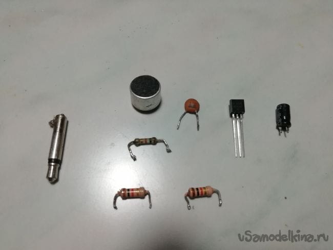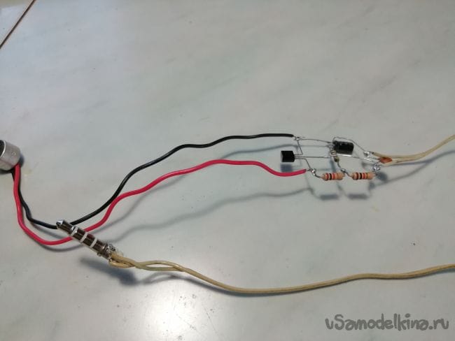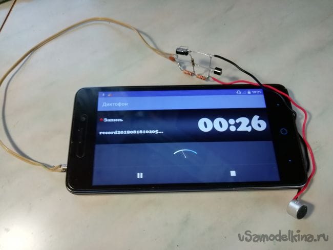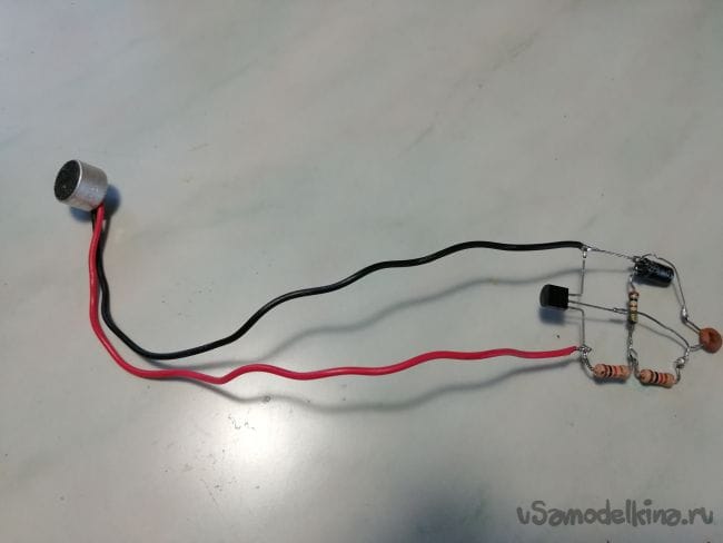 Собираем все навесным монтажом так получиться более компактнее после сборки подключаем и проверяем на простом диктофоне. Если у нас заработало, то собираем дальше, а если звук не записывается то нужно проверить полярность подключения микрофона и штекера.