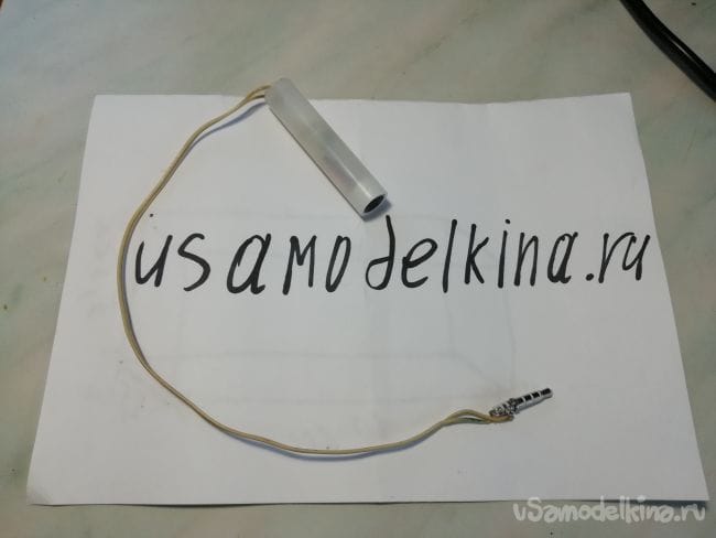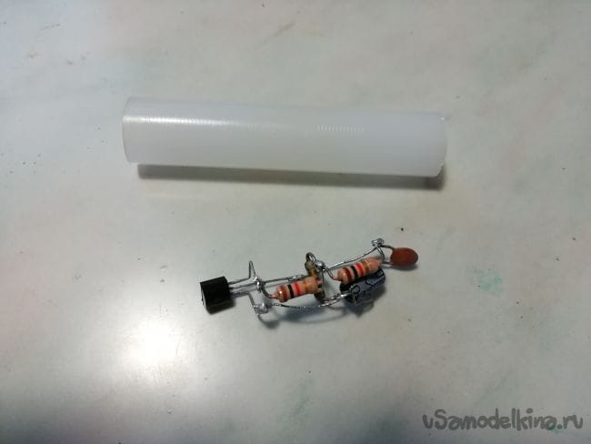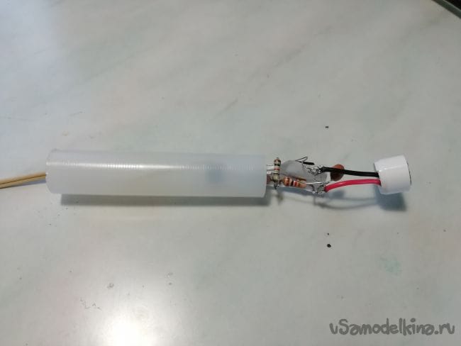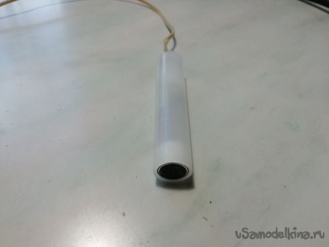 Дальше помещаем все в корпус я использовал пластмассовую трубку можно использовать шприц или любые другие корпуса.
