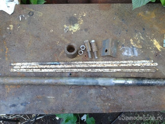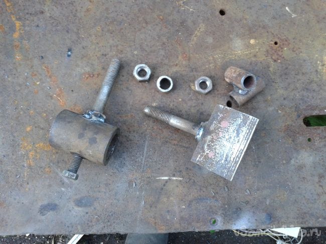 Полдюймовые трубки свариваем крест-накрест. Один болт М14 привариваем к уголку, второй болт привариваем к втулке. С противоположной от места сварки стороны втулки сверлим и нарезаем резьбу М12.