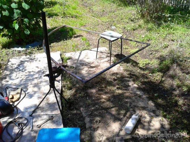 Собираем конструкцию.На фото видно, что пришлось на болт со втулкой поставить проставку. Это сделано для того, чтобы уголок не задевал стойку. Так что лучше сразу одну полдюймовую трубку отрезать длиннее.