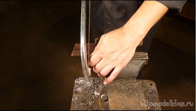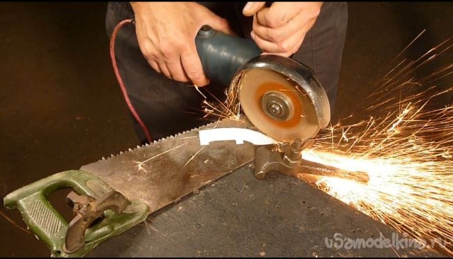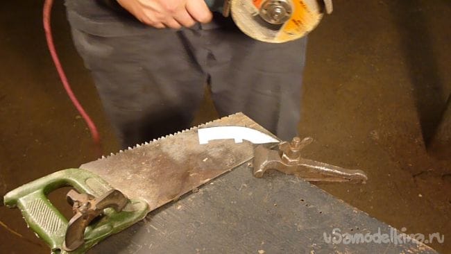 Нарисовали на бумаге примерную форму лезвия, приклеили к полотну старой ножовки по дереву и вырезали при помощи болгарки.