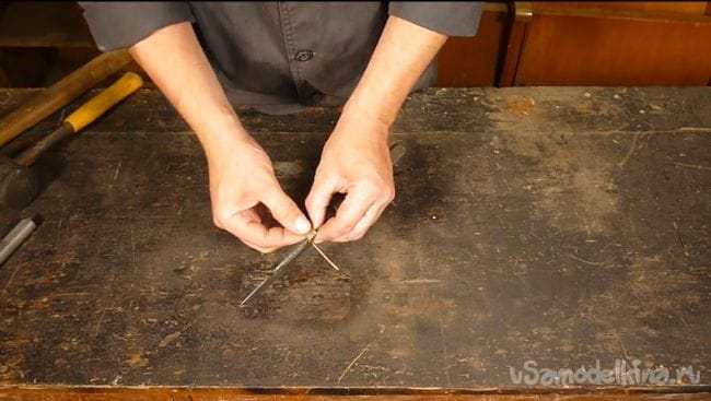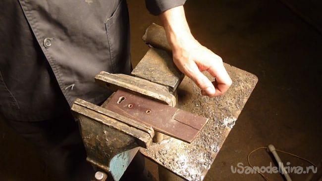 Зафиксировали хомут на лезвии медной проволокой, обогнули и просверлили второе отверстие.