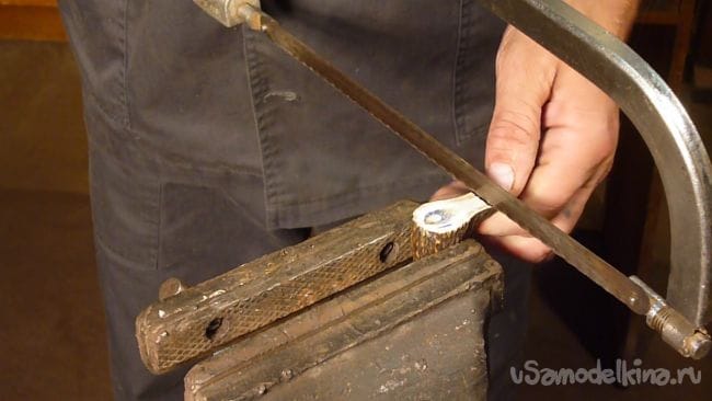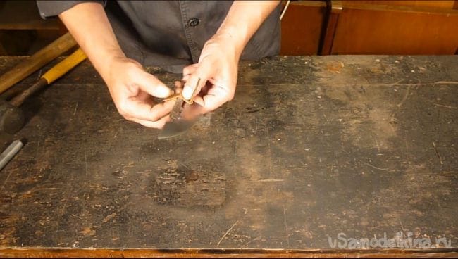 От куска листовой меди отрезали две полосы примерно по 1 см. шириной. Это будут декоративные хомуты, которые скроют места сварки.